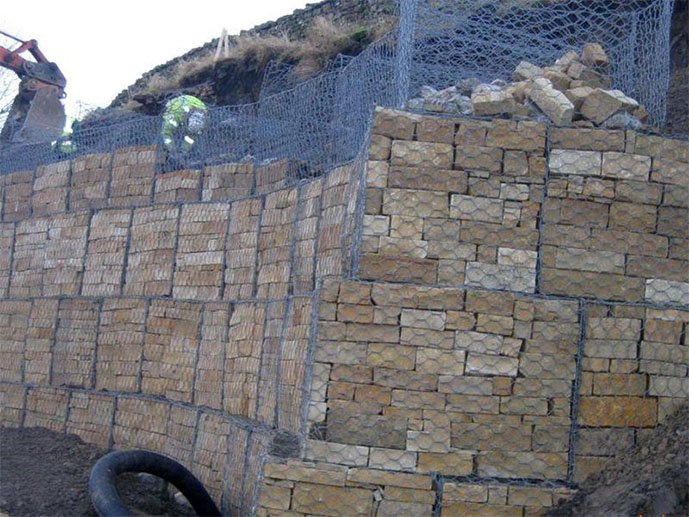 石籠網是金屬線材編織的角形網(六角網)制成的網箱,使用的金屬線徑是根據六角形的大小而不同。如果是金屬鍍層的金屬線六角形,則使用線徑為2.0mm到4.0mm的金屬線,如果是PVC包覆的金屬線編織的六角網,則使用外徑為3.0mm到4.0mm的PVC(金屬)線.外框邊緣的線則使用比六角網線粗一號的線。