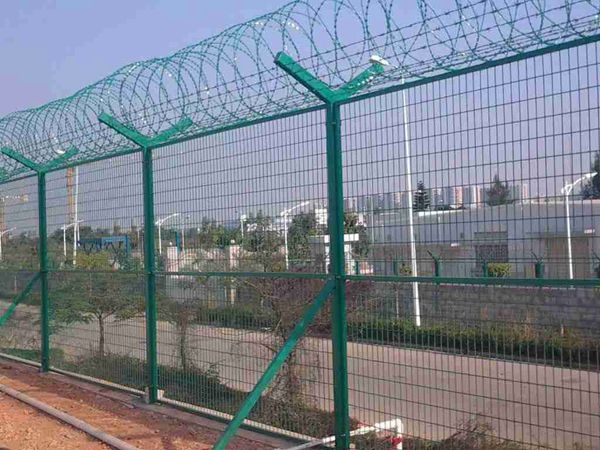 機場圍欄網又稱作“Y型安全防御護網”,是由V型支架立柱,加強型焊接片網,安全防盜連接件和熱鍍鋅刀片刺籠組成強度和安全防御性級別很高。近年來,被廣泛應用在機場,軍事基地等高安全場所。注:如果在機場護欄網頂部加裝刀片刺絲、刀片刺繩后又很好的增強了安全防護性能。采用電鍍、熱鍍、噴塑、浸塑等防腐形式,具有很好的抗老化、抗曬、耐候等特點。其產品造型美觀、花色多樣,既起到圍欄作用,又起到美化作用。由于具有安全性高、防攀爬能力好,網片連接方式采用特制SBS緊扣件,有效防止人為的破壞性拆卸,橫向四道折彎加強筋,使網面強度顯著增加。
